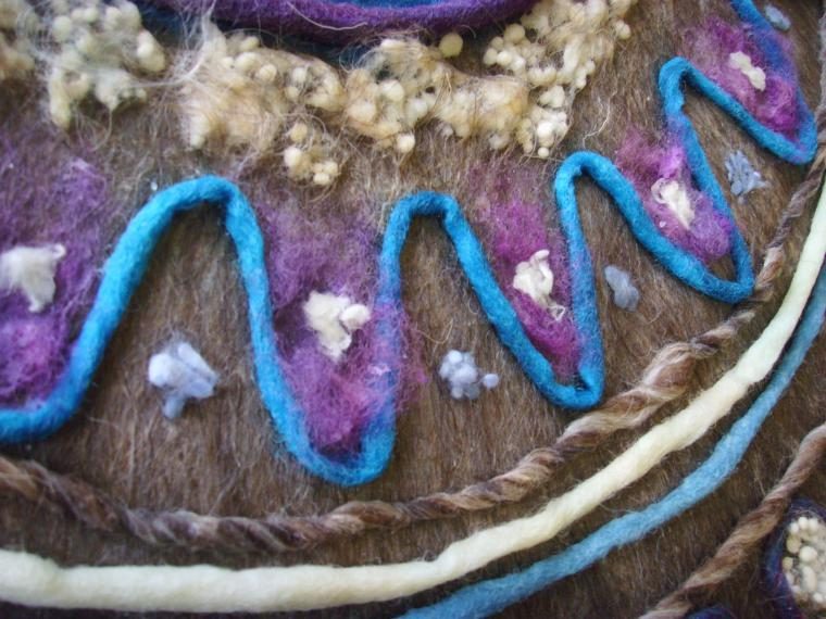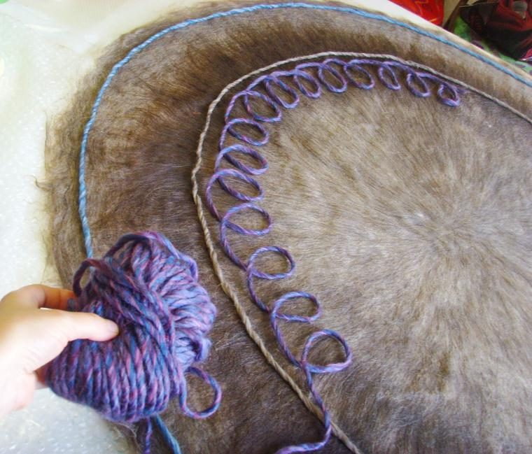 Мне захотелось добавить более плотных жгутов, сваляных из шерсти (из ровницы также продолжаю выкладывать узоры по периметру ковра).