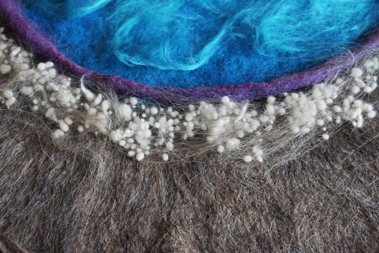Потом я укладывала слой по окружности (с краю можно увидеть направление шерсти, на тот момент я не успела его заложить). И так чередовала все слои.