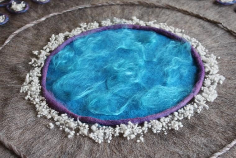 По краю — другую. Фиолетовой ровницей начинаю выкладывать петельчатый узор внутри большого круга.