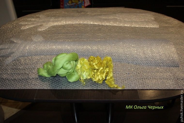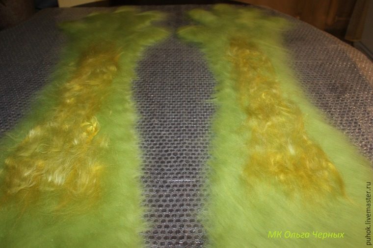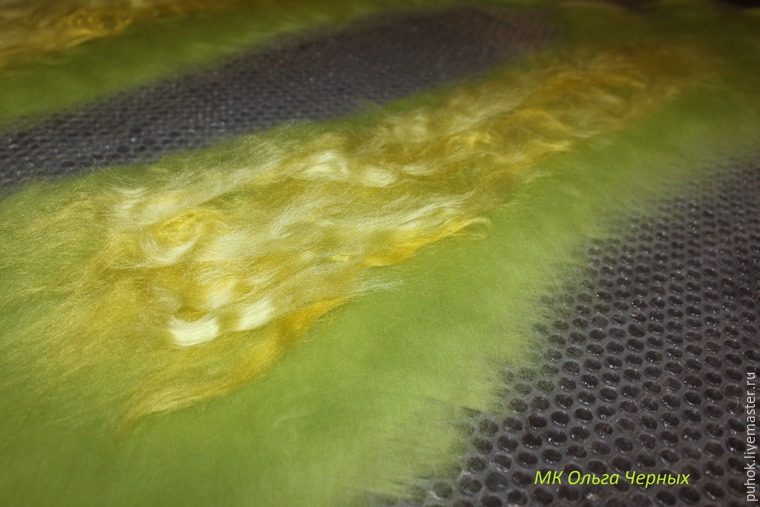 Начинаем раскладку. Обязательно прокладываем ряд шерстки параллельно открытого края, закрепляем его, чтоб он не растягивался при носке.