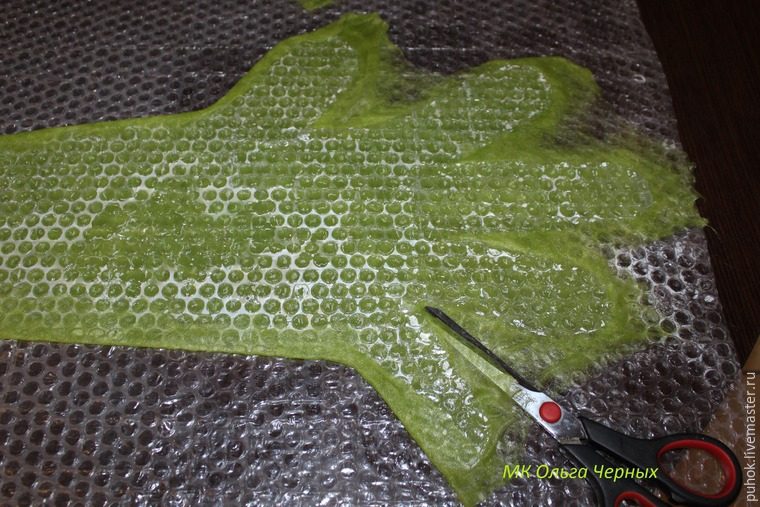 Перед началом работы подготовьте шаблон. Обводим руку, пальчики растопырим, или рисуем по имеющимся у нас размерам. Не забываем увеличить на 30-40% или используем ваш КУ (коэффициент усадки). Мне для выкройки больше нравится пупырчатая пленка или подложка под ламинат. Проще разглаживать бока, когда снимаем с шаблона.