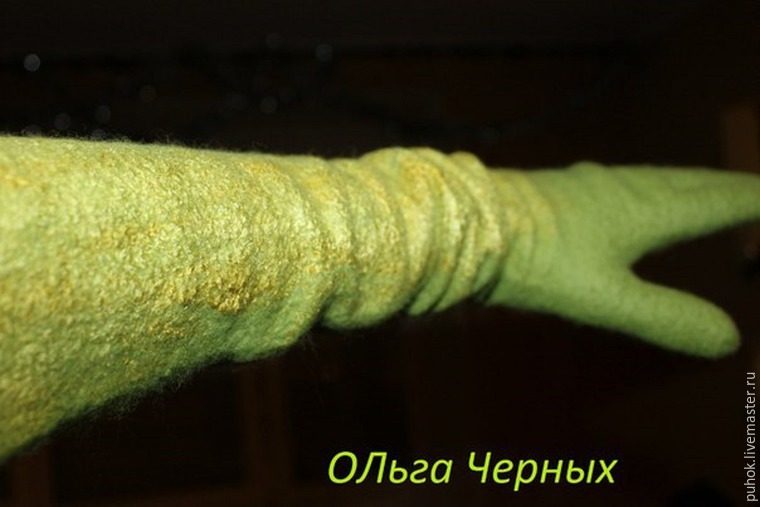 Снимаю с шаблона, хорошенько притираю, расправляю все наши ребра, тщательно между пальчиков! Вымешиваю, как тесто, минут 10, постоянно разворачивая и расправляя. Надеваю на руку и формирую перчаточку по руке. Не забываю про большой пальчик, его нужно при валянии чуть развернуть, поставить на место. Хорошенько выполаскиваю, смотрю на результат. Если меня не устраивает качество, вновь намыливаю и еще валяю.
