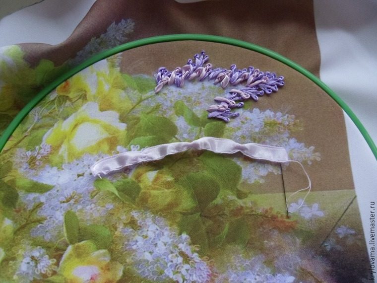 Потом отступая от кончика ленты 0,5 см вставляю иглу в ткань, так получается французский узелок на ножке.