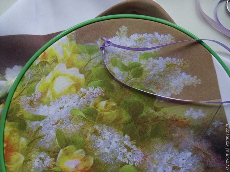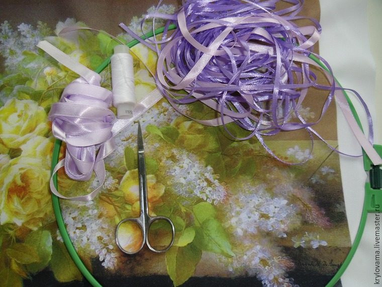 Для этого мне нужно атласные ленты 4 и 6 мм для бутонов, 1 см лента для цветов, 2,5 см лента для листьев и стеблей, пяльцы, нитки, ножницы, зажигалка и принт.