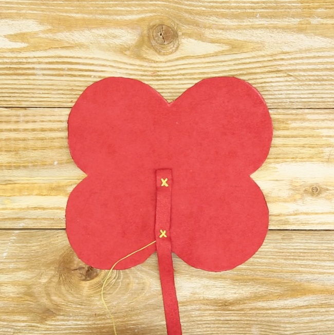 Кладем один конец полоски в середину нашей заготовки и пришиваем ее стежками в виде буквы Х в двух местах, как на картинке.