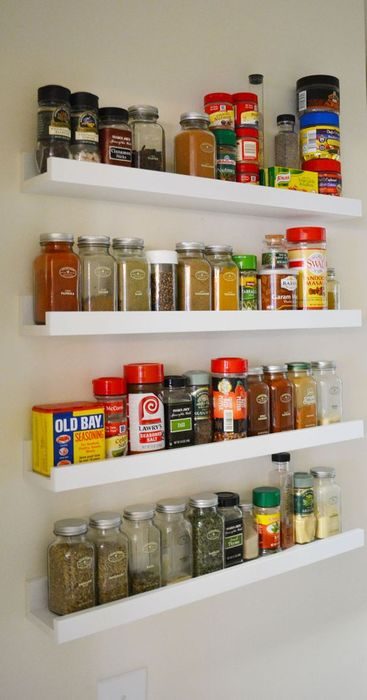 Узкая полка с бортиком – отличное решение для кухни. На ней легко разместить баночки со специями и установить их на любом отрезке стены – у плиты, над мойкой, около рабочей поверхности. И больше не придётся искать перец, розмарин или соль в многочисленных шкафчиках.