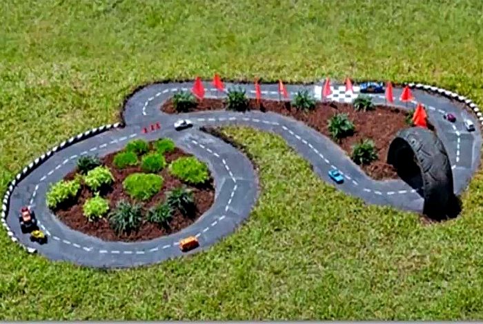 Замечательная идея для отцов и мальчиков — смастерить на даче гоночную трассу из старых автомобильных покрышек. Совместная работа над треком и последующие игры принесут массу позитива и детям, и родителям.