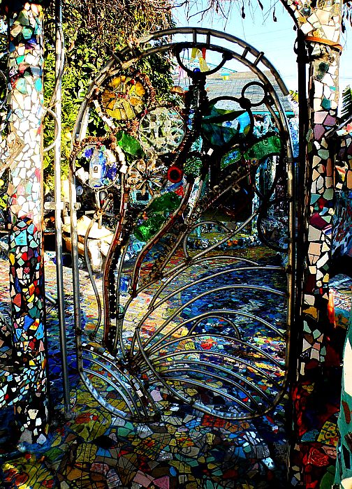 Калитка, украшенная ковкой и разноцветной мозаикой, станет запоминающейся деталью всего участка.