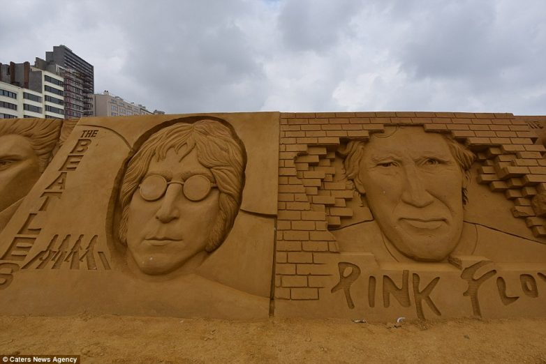 На фестивале представлены песчаные скульптуры известных исполнителей и музыкантов: Тины Тёрнер, Марвина Гэя, Джона Леннона (слева) и лидера группы Pink Floyd Роджера Уотерса (справа).