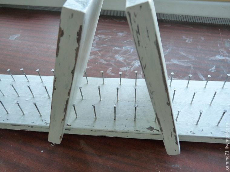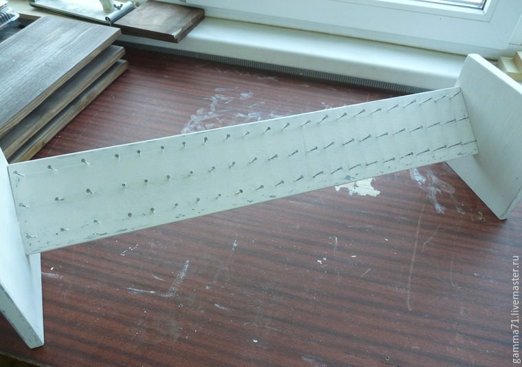 Не стала заморачиваться деревянными штырьками, а пошла более легким путём — разметила фанеру и дала любимому племяннику-подростку вволю показать свою молодецкую удаль и постучать молотком, вбивая гвозди по меткам. Что он и сделал с большим удовольствием — грохот от стука молотка правда очень давил по ушам, но беруши некоторым образом его смягчали. Как вариант: можно взять шурупы такого же размера и закручивать их дрелью по разметкам. Главное, чтобы длина вбитого гвоздя-шурупа не превышала высоты катушки — совсем не хочется лицезреть их железные концы среди разноцветных красавиц-катушек.