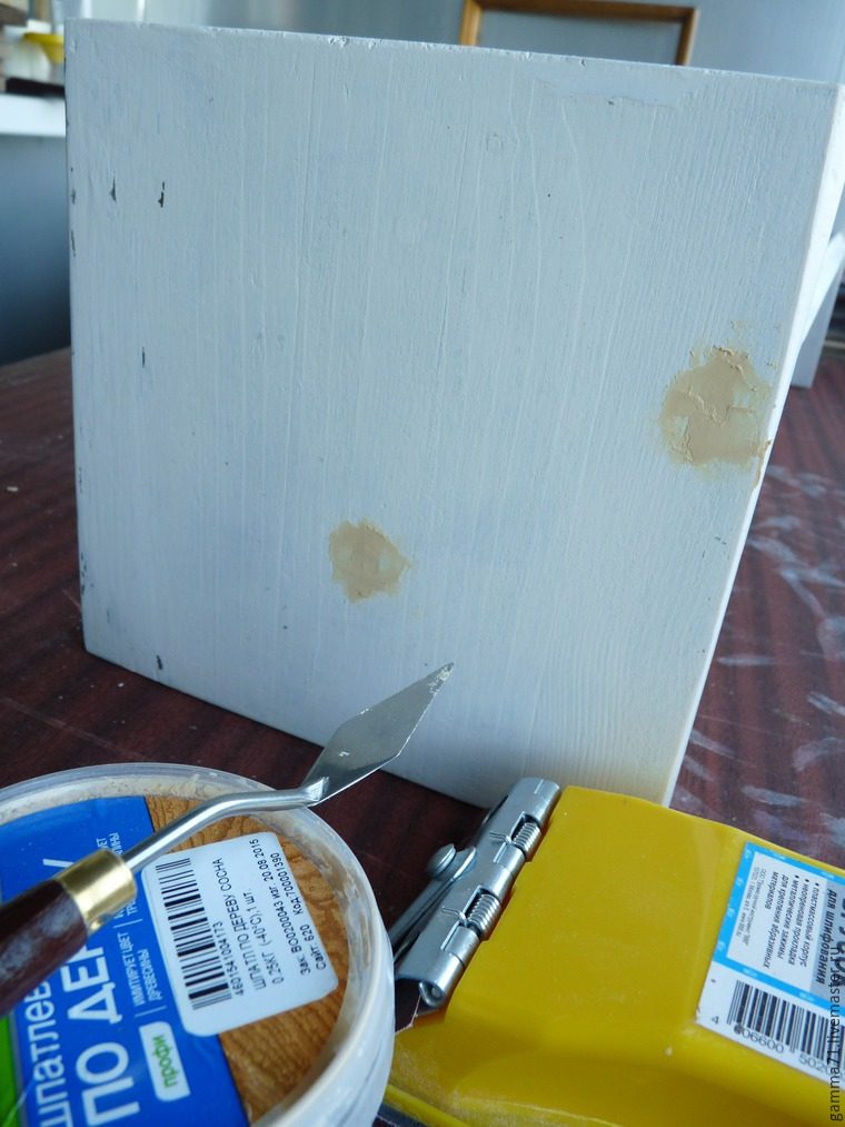 Собрала полочку с помощью шуруповёрта, зашпаклевала места крепления шурупами шпатлёвкой.