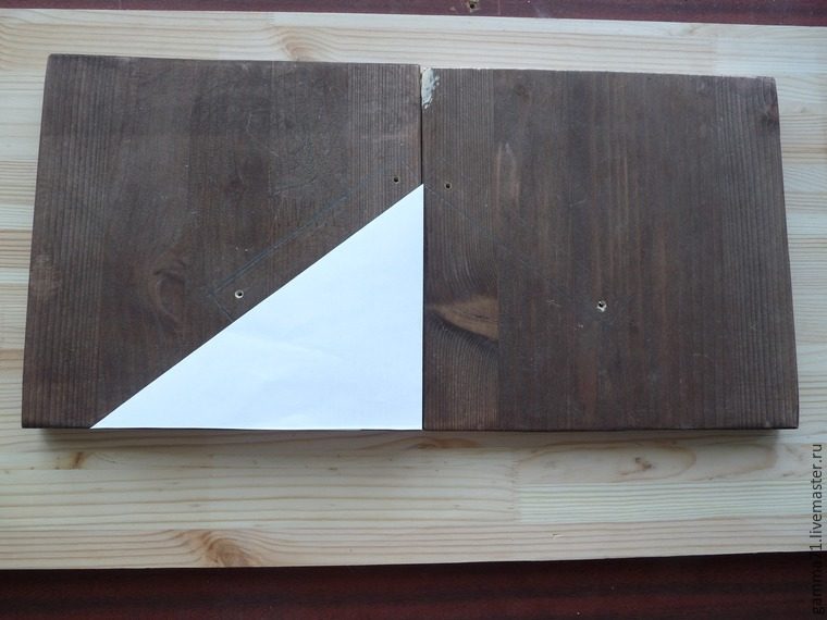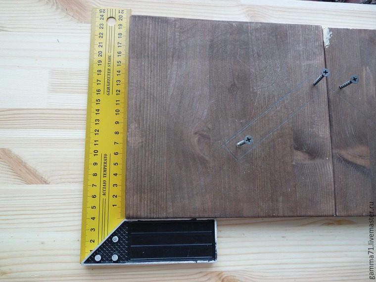 Можно было просто фанеру соединить с боковушками — получилась бы перевёрнутая буква П и катушки бы стояли перпендикулярно столу. Но мы не идём лёгкими путями и хотим видеть разноцветье катушек, как только кинем на полку взгляд! Поэтому основание решила закрепить под наклоном. Для симметричной разметки на обоих боковушках вырезала трафарет и по нему карандашом разметила положение торцов основания на боковушках.