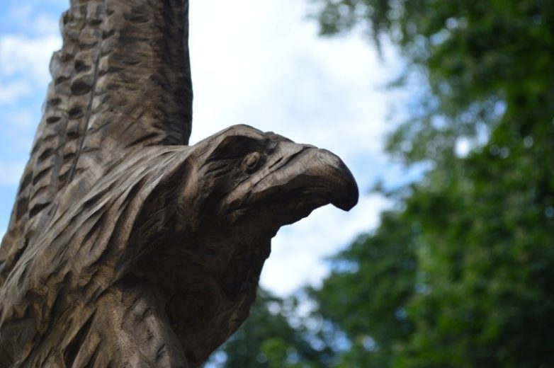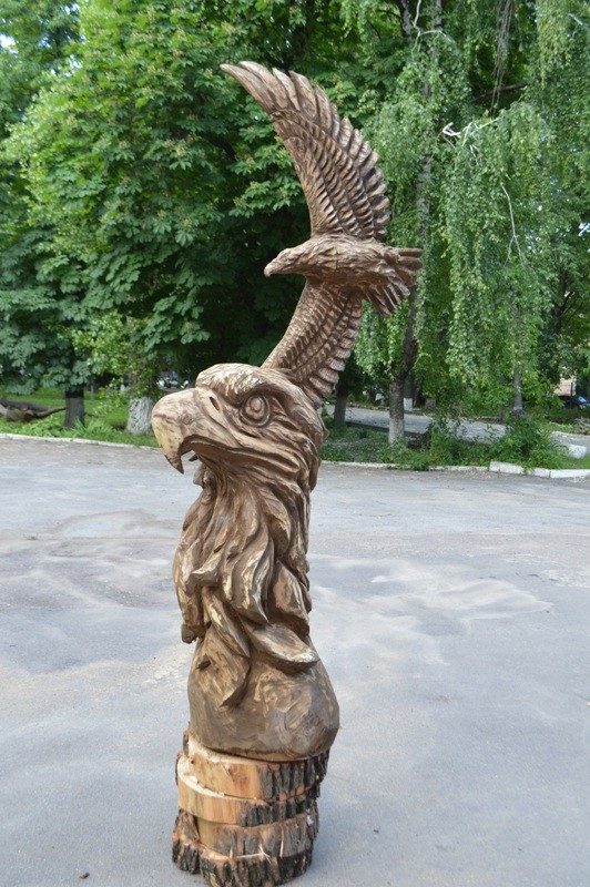 В последнее время работаю в парке у бывшего Камерного театра. Туда удалось привезти 5-6 кубов вязов, срезанных по санитарной рубке. Из этих вязов понемногу и колдую. Отдельно повторю, а то из темы в тему одно и то же пишут: «Зачем губишь деревья?!» Я их не гублю. Я им лаю вторую жизнь. Вот эти вязы срубили коммунальщики и хотели выбросить. Предложил другой путь. На первом плане — будущий орел. Уже похож.