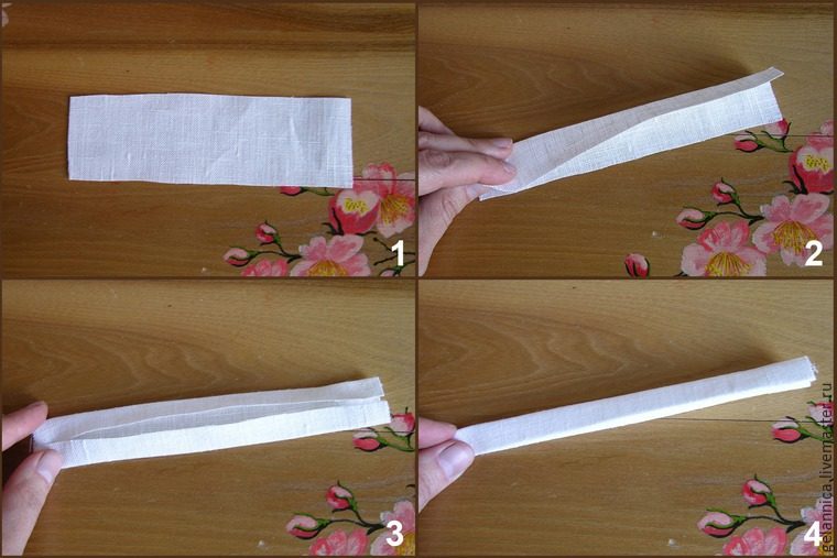 1. Возьмите прямоугольный лоскут ткани для создания тела куколки, сложите его вдоль в 4 раза краями внутрь.
