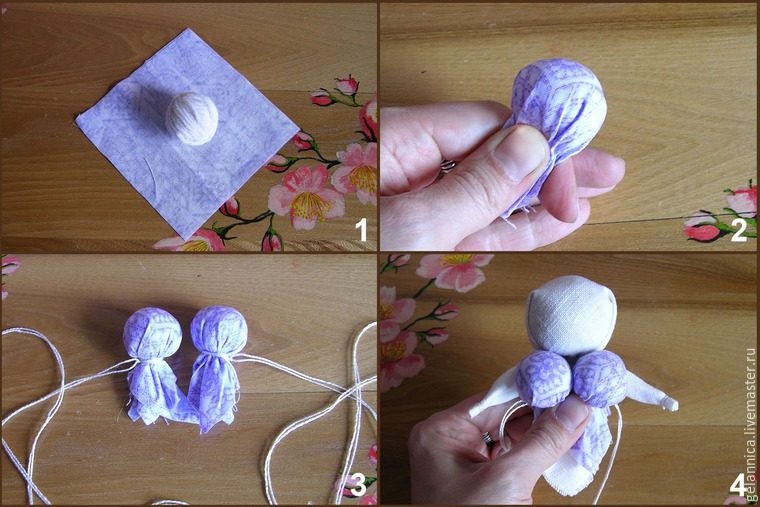 *** При изготовлении тела и закреплении одежды на теле куколки не используется игла. Поэтому перевязывать куколку и привязывать к ней одежду необходимо следующим образом: сделать несколько тугих оборотов нити по часовой стрелке (по направлению от себя) и завязать на четное количество узлов. Концы нитей отрезать на расстоянии 2-3 мм от узла. (Это правило относится ко всему процессу изготовления куколки.)