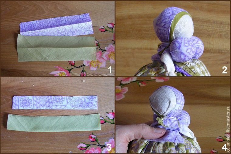 14. Лоскуты, приготовленные для очелья сложите вдоль пополам, при необходимости прогладьте, наложите друг на друга, оберните им голову и привяжите несколькими оборотами нити на уровне шеи. Лишние концы лоскутов отрежьте.