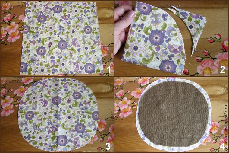 8. Возьмите квадратный лоскут для юбки, сложите в 4 раза и вырежьте из него круг, диаметром 25 см. Возьмите лоскут мягкой ткани и вырежьте лоскут диаметром около 23 см. Вместо мягкой ткани можно использовать шерсть или вату, чтобы юбочка снаружи была мягкой и округлой.