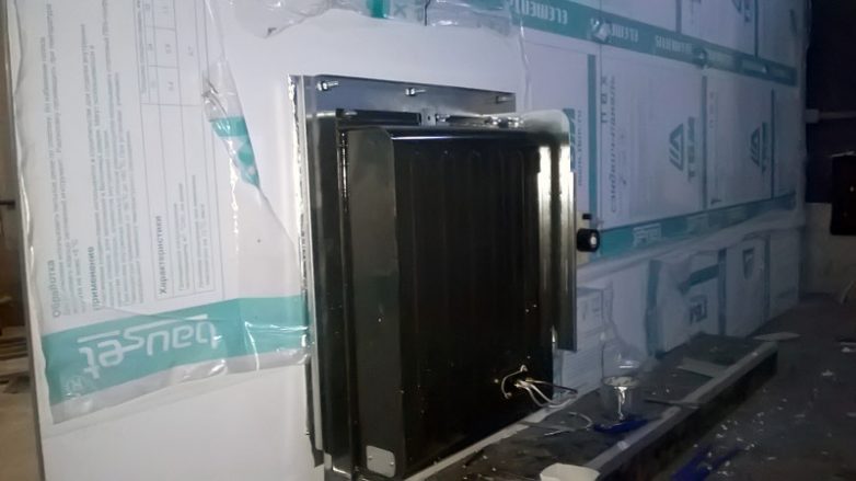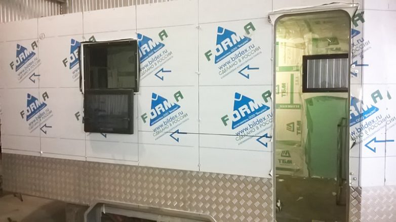 Вырезаем проёмы и устанавливаем окна. Предварительно на этапе каркаса там уже сварена рамка. Одно окно у нас будет открывающееся, второе глухое и маленькое смотровое окно в боковой двери. Окна — однокамерный стеклопакет из тонированного каленного стекла. Они не промерзают и не покрываются изнутри инеем.