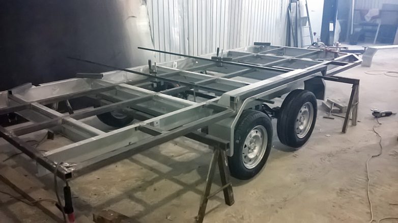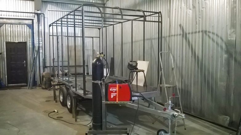 Из профильной трубы 40х40 формируем платформу трейлера, плюс усиливаем заводскую раму. Платформа будет шире заводского кузова, поэтому над колесами формируем арки. К дополнительной жесткости внутри рамы и на заднюю ось устанавливаем стабилизатор поперечной устойчивости.