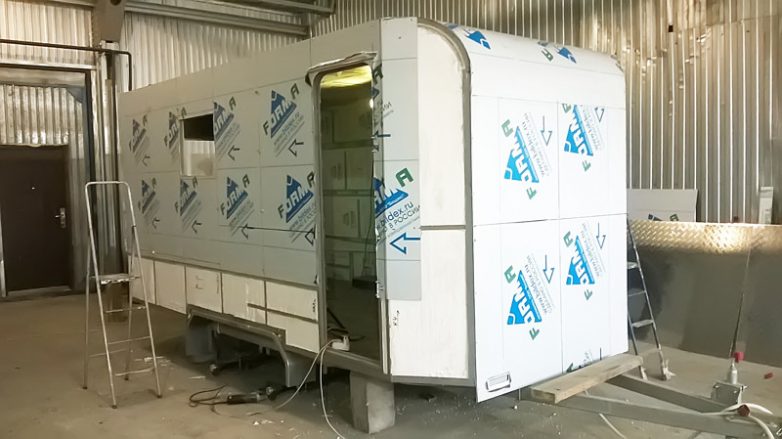 После подгонки всех деталей каркаса окрашиваем его, прокладываем проводку и начинаем обшивку.Внутри обшиваем сандвич панелью – 10мм. на автомобильные пластиковые клипсы, для уменьшения мостиков холода. В промежутки между стойками каркаса – пенополистирол 25 мм. + монтажная пена. Снаружи обшиваем композитным алюминиевый листом + рифленый алюминий. Устанавливаем новые подкрылки из оцинкованной стали.
