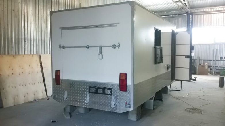 Завершаем все работы снаружи кемпера. На заднюю откидную дверь устанавливается штанговый запор. На углы кемпера устанавливаем стальной, окрашенный порошковой эмалью, уголок 45х45х1 мм. На дышло устанавливаем ящик для баллонов с газом + крепление под запаску и лестницу для доступа на крышу. Ставим на место колеса, выезжаем на улицу для проверки.