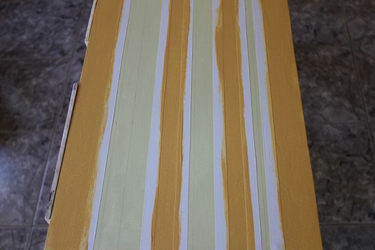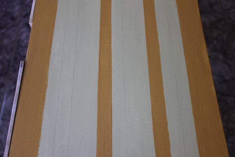 Нижнюю часть боковой панели окрашиваем акриловой краской под «обои в полосочку», для этого расчерчиваем полосы любой ширины (согласно задумке). Чтобы удобно было окрашивать, наклеиваем по линиям малярный скотч, прокрашиваем выделенные участки, даем чуть-чуть подсохнуть и снимаем скотч.