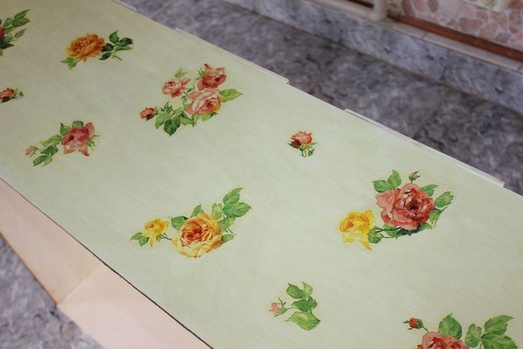 Теперь, по задумке, надо немного приглушить цвет, то есть чтобы букетики выглядели немного выцветшими. Для этого наливаем в баночку немного лака, добавляем в него несколько капель светло-зеленой краски и этим раствором покрываем декорируемую поверхность. Когда лак высохнет, на поверхности останется некая пелена, которая приглушает яркость красок.