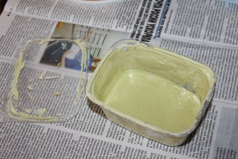 Смешиваем акриловую краску так, чтобы получился необходимый нам оттенок — как на салфетке. Не забываем, что нам надо декорировать две стороны, поэтому смешиваем побольше, а чтобы краска не засохла, делаем это в одноразовой баночке с крышкой — удобно хранить, да и краска не засохнет.