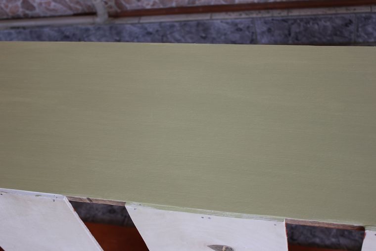Цвет оказался очень ярким, поэтому разводим светло-зеленую краску водой и проходимся по всем поверхностям, обработанным морилкой. После высыхания цвет становится спокойным, как бы тускнеет.