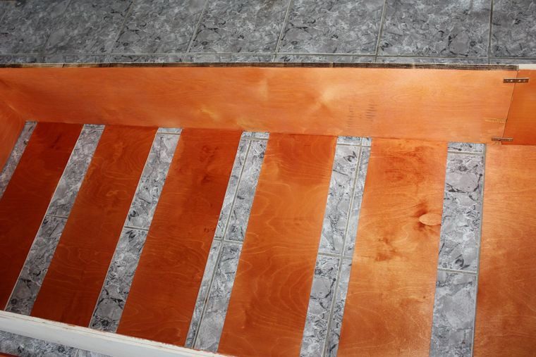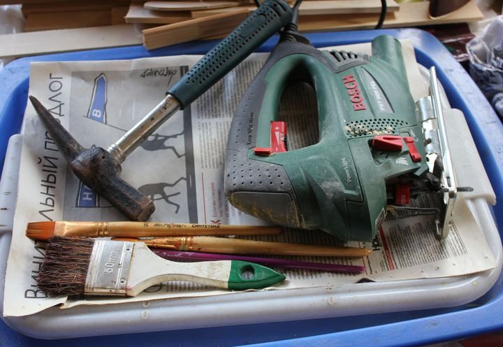 Полочки необходимого размера выпиливаем из фанеры 10 мм (я взяла 6 мм, но это тонковато, если материалы тяжелые), тонируем морилками или разведенным акрилом, сушим, шкурим до гладкости и ставим на свои места.