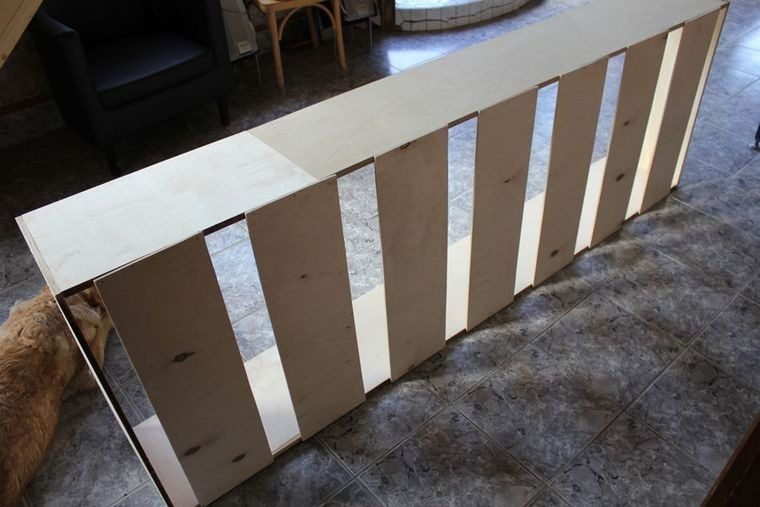 Заднюю стенку необязательно делать сплошной, поэтому я подготовила 9 досточек 70х20 см, и прибила их к каркасу.
