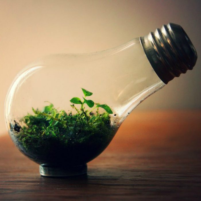 Невероятно, но старые лампочки можно превращать в сказочные украшения дома. Нужно просто удалить внутренности лампочки, засыпать внутрь сухую почву и аккуратно высадить в нее суккуленты или любые другие растения, которые могут расти без почвы. Украсить композицию можно с помощью сухого мха.