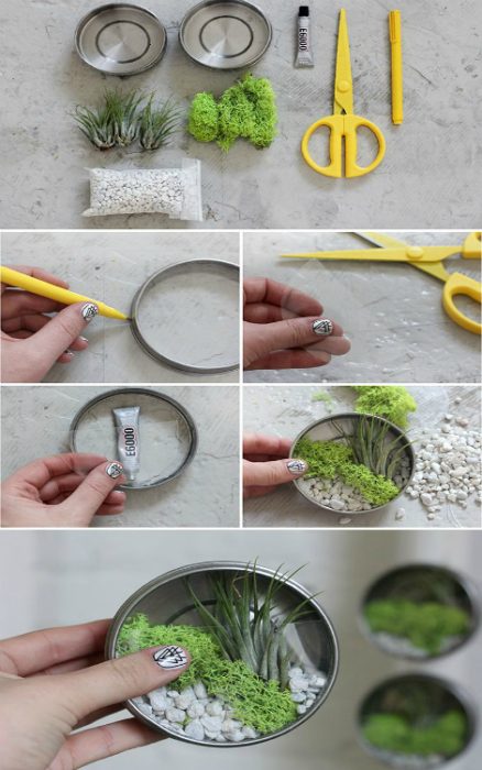 Очаровательная композиция из растений, сухого мха и цветного гравия, помещенных в алюминиевую крышку от банки.