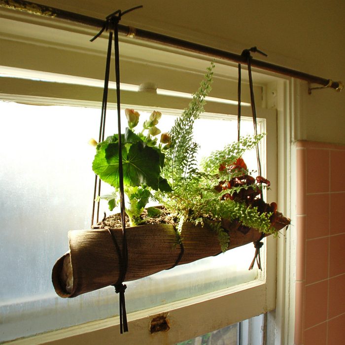 Висячий сад, сделанный из пальмового листа и кожи, станет креативным украшением окна или стены.