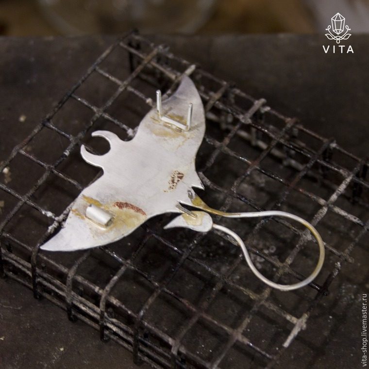 Переворачиваем заготовку, припаиваем к ней брошный механизм и хвост. Кончик хвоста к этому моменту уже должен быть напаян.