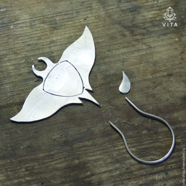 «Выкройку» вырезаем, прикладываем к заготовленному листу металла и выпиливаем. Из толстой проволоки делаем хвост. Камень я решила перевернуть, а кончик хвоста сделать каплей.