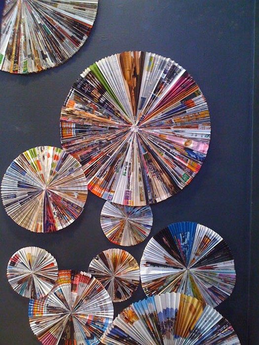 6. Любители постоянно менять декор квартиры без особых затрат могут сделать панно из кругов разного диаметра, выполненных из глянцевых страниц