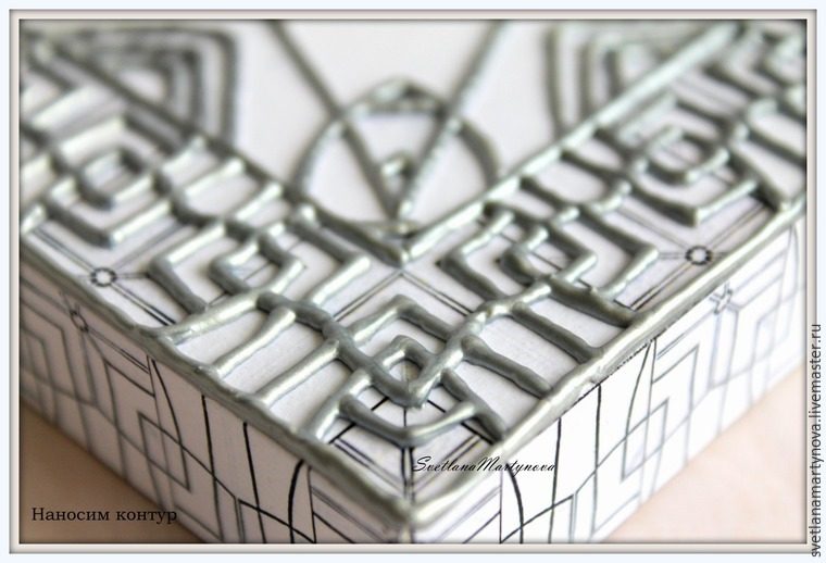 Так как наш коробочек будет расписан со всех сторон, наносим контур этапами. С просушкой каждой стороны. Это занимает около 1 часа (на 1 сторону), иначе вы рискуете смазать рисунок или «раздавить» его, положив заготовку на ту сторону, где контур уже нанесен.