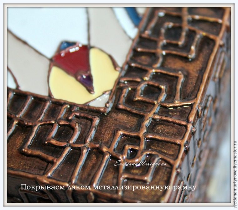 7. Одновременно с заливкой краской, покройте наши металлические поверхности Лаком-разбавителем. Он придаст этим участкам глянец и защитит от стирания воска с контура. Это делается так же кистью, только можно взять по толще, например, №2 или №3.