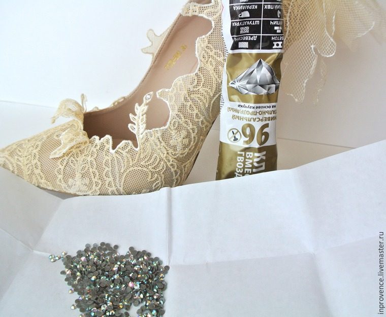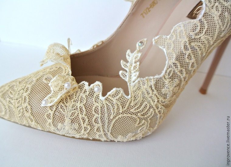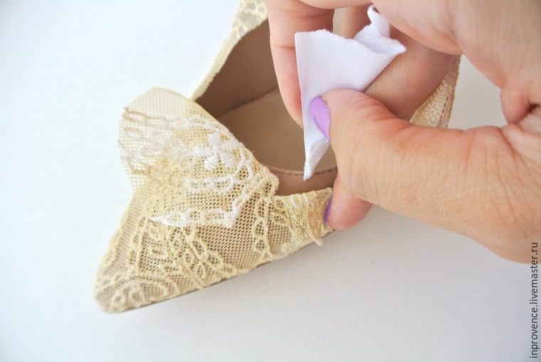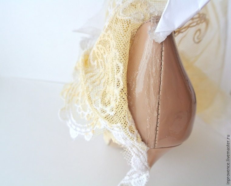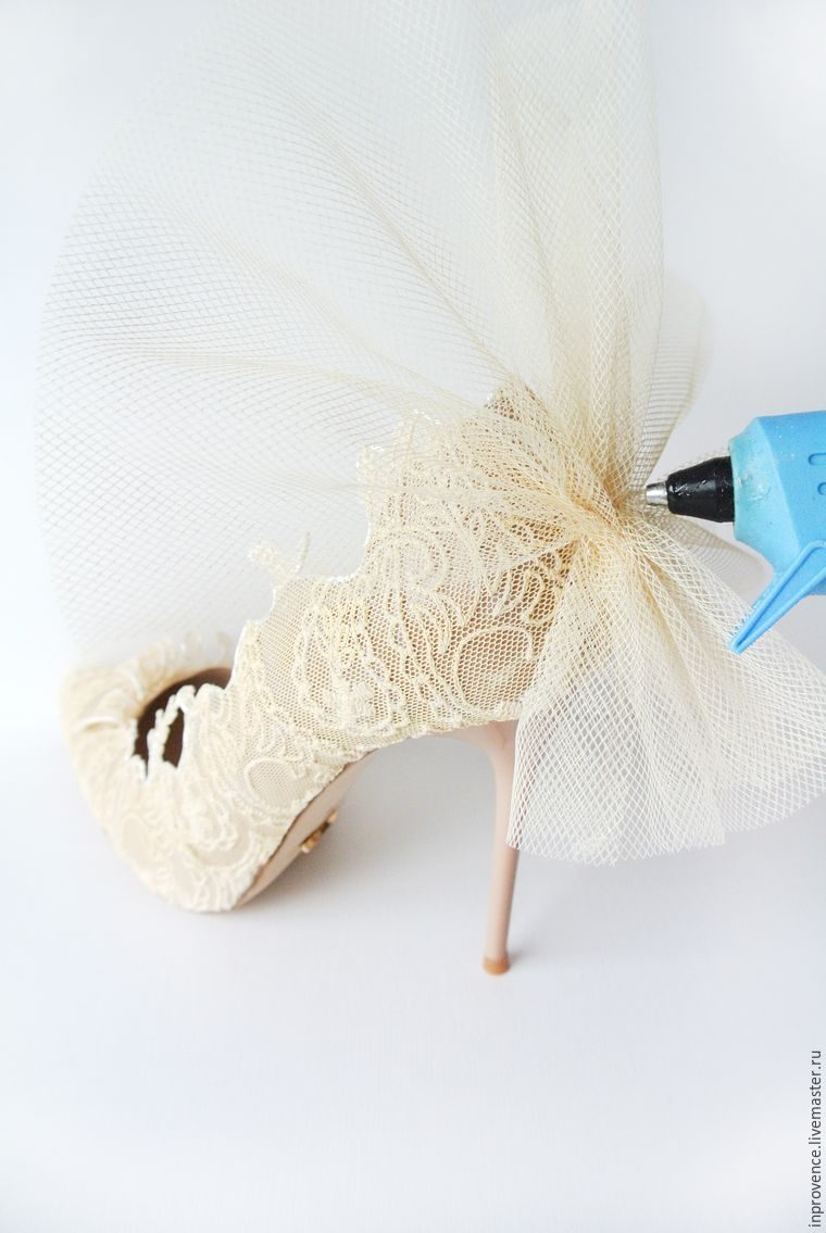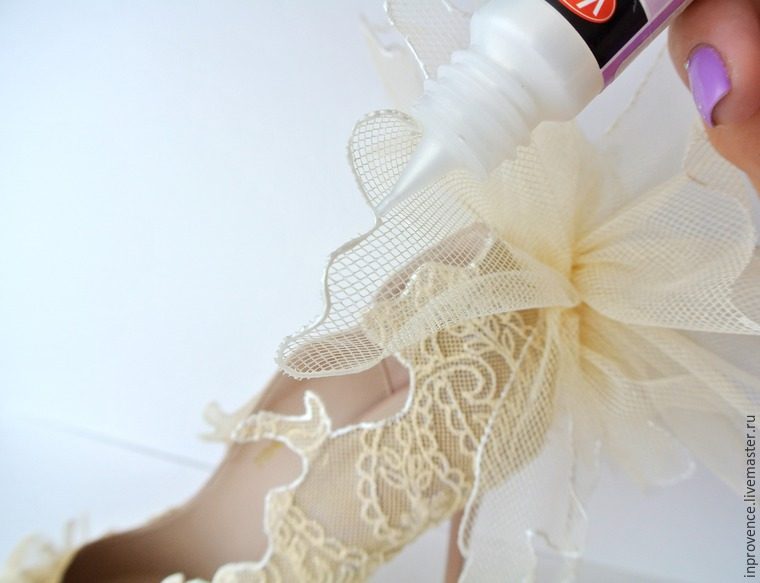 Прикладываем кусочек материи к туфлям и планируем, как будут располагаться узоры. Можно использовать и просто фатин, а потом в процессе просто приклеить необходимые кружевные нашивки, как вам больше нравится. Я использовала для этой цели кружево на сетке.