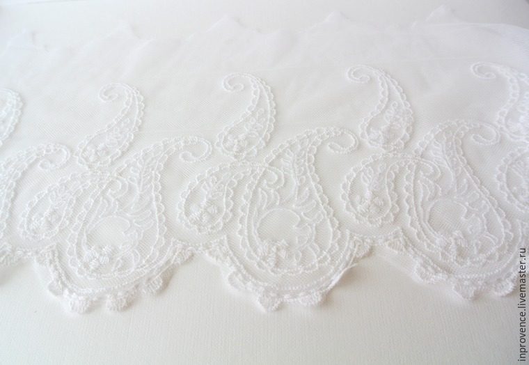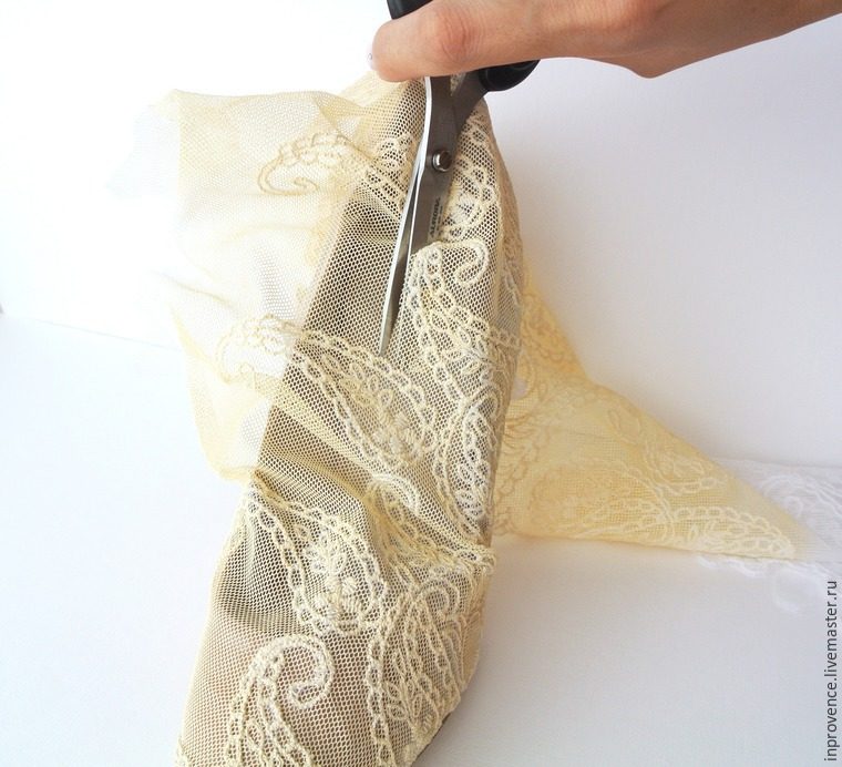 Поскольку у меня не было нужного цвета гипюра и фатина, изначально я окрасила белые материалы акриловыми красками цвета айвори. Используйте для этого спонж или кисть.