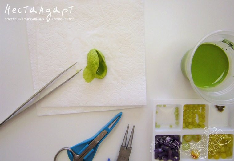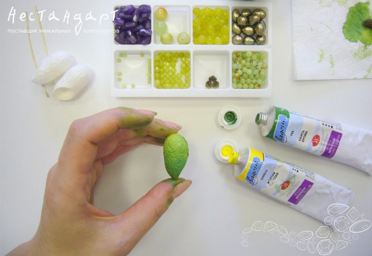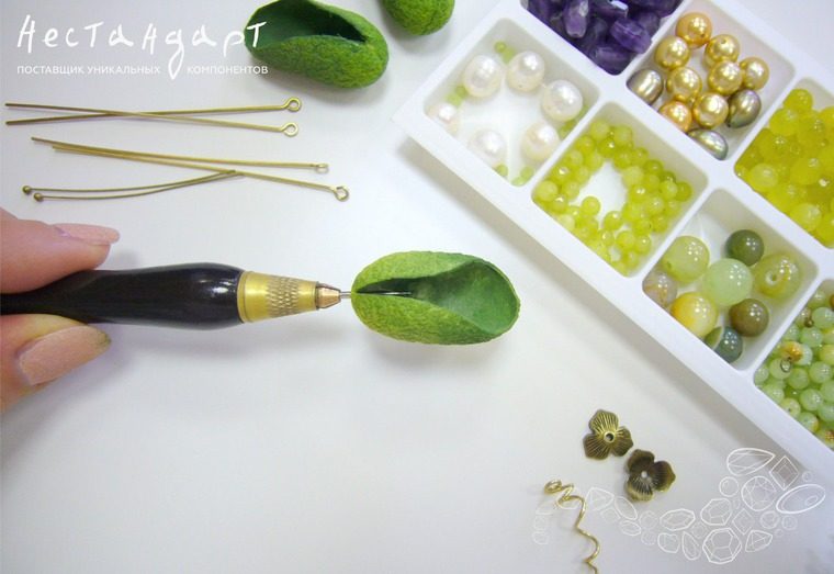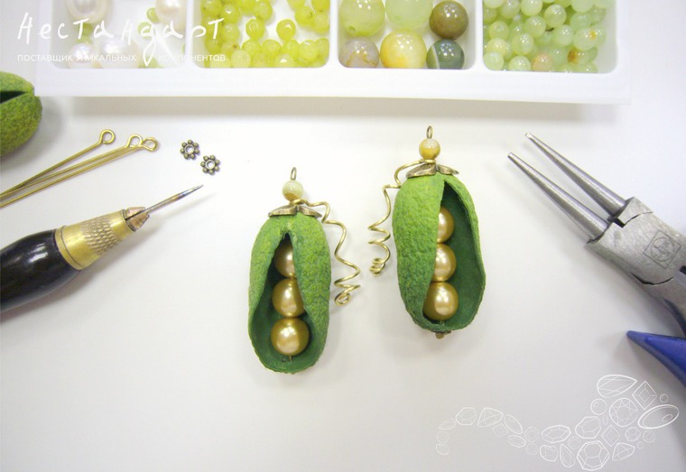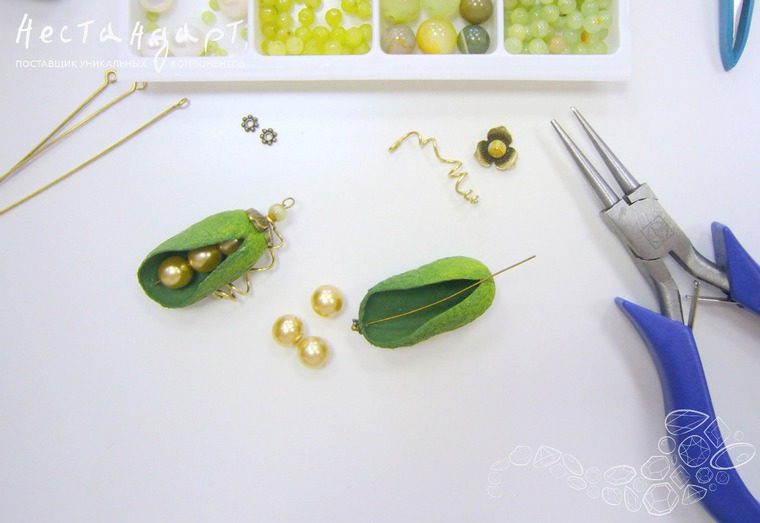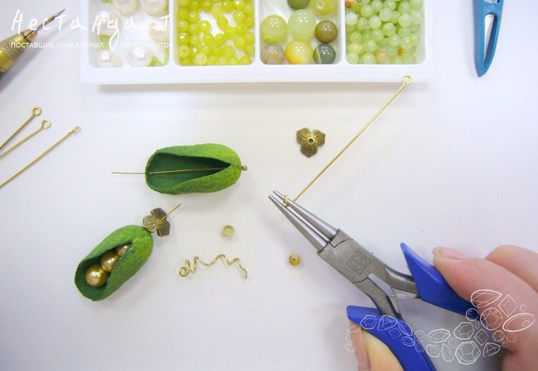 В отверстия коконов вставляем пины, нанизываем бусины.