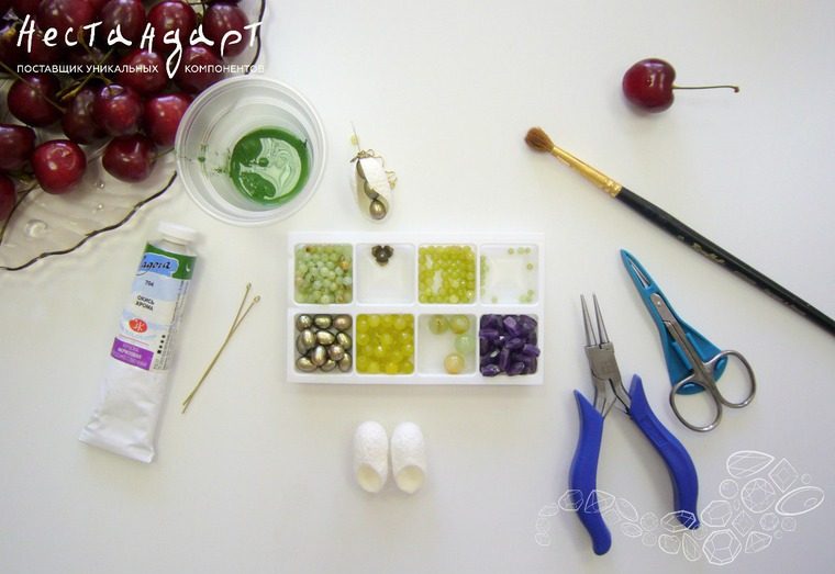 Сборку начинаем снизу. Вставили пин с шариком, нанизали бусины.