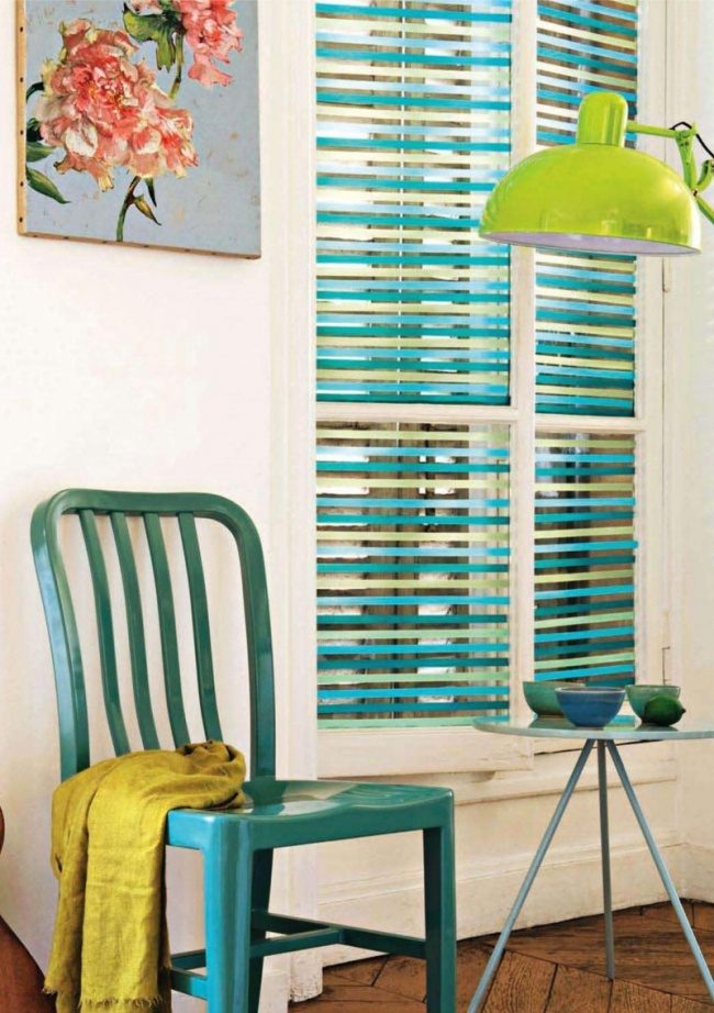Жалюзи, декорированные цветным скотчем в тон другим деталям интерьера, будут смотреться намного эффектнее.