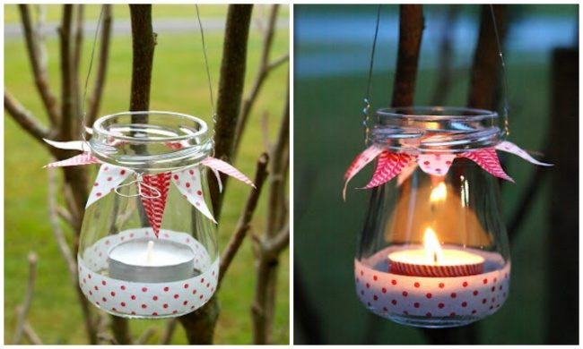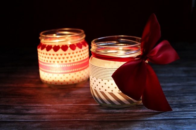 Чайные свечи в подсвечниках, оформленных декоративным скотчем, — прекрасный декор для собственного дома и хороший подарок.
