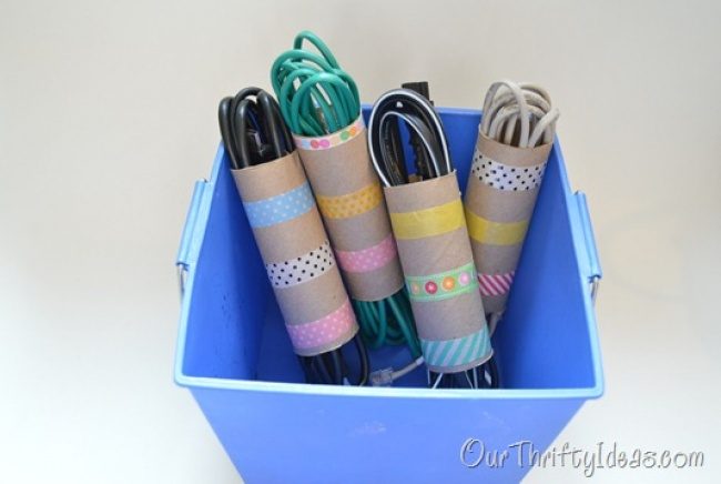 Простые картонные чехлы помогут держать все провода в порядке. А цветная лента сделает их непохожими друг на друга.