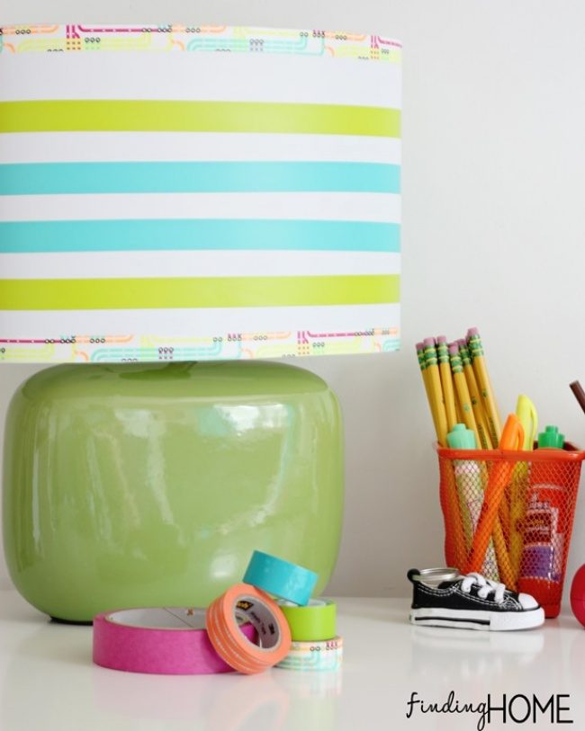 С помощью разноцветных полос можно освежить абажур настольной лампы.