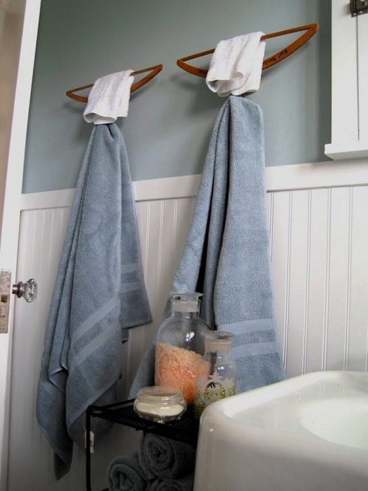 Симпатичное решение для того чтобы создать оптимальную атмосферу в ванной комнате при помощи обычных вешалок.