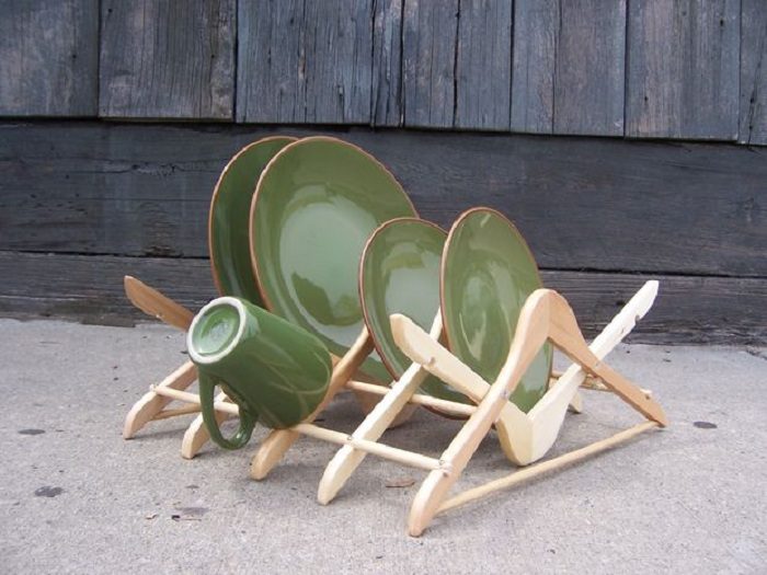Создать оптимальную подставку для посуды возможно при помощи обычных вешалок для одежды.