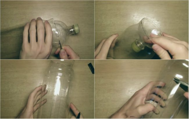 Чертим маркером прямоугольник шириной в 2 см по длине бутылки и получаем продольное прямоугольное отверстие